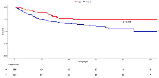 The initial univariate analysis revealed higher ICU mortality (29.2% vs. 18.8%, p < 0.014) and in-hospital mortality (32.5% vs. 18.8%, p < 0.002) in patients presenting clinical respiratory distress along with profound hypoxemia and ARF, compared to those presenting silent hypoxemia. A survival curve was generated for these two subgroups, allowing for the visualization and comparison of their survival over 120 days (Figure 2, log-rank p = 0.004). Survival at 60 days was lower for patients in clinical respiratory distress hypoxemia compared to those with Phenotype I, with a survival rate of around 59% and 75%, respectively. At 120 days, the survival rate similarly leveled at 75% for silent hypoxemia patients, yet it decreased to around 40% for Phenotype II. However, when comparing the mortality rates of both phenotypes, multivariate analysis revealed no significant difference both in-ICU mortality (aOR = 2.385, CI 95%: 0.715–7.950, p = 0.157) and in-hospital mortality (aOR = 3.079, CI 95%: 0.932–10.171, p = 0.065). Excessive mortality might be further associated with Phenotype II patients. The survival findings are summarized in Figure 2 and Table 3.