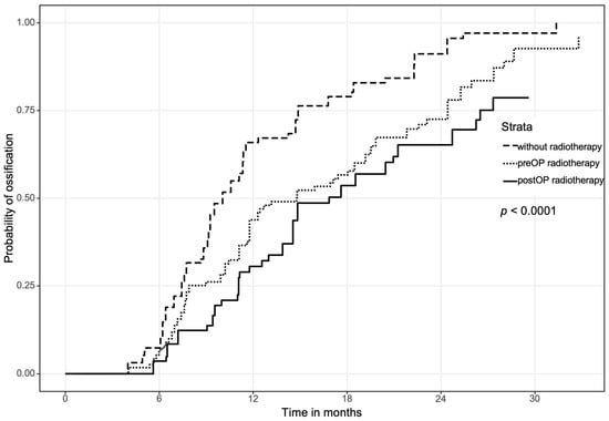 The overall median for complete ossification at the point of contact was 510 (IQR 398–622) days for the postORT subgroup, followed by the preORT subgroup with 447 (IQR 311-583) days. The fastest ossification was observed in patients without any radiation (304 IQR 267–341 days). Patients of both groups who underwent radiation showed significantly slower complete ossification p < 0.001 than nonirradiated ones (Figure 2). Between the two subgroups with radiation therapy, no significant difference (p = 0.087) in overall ossification was observed.