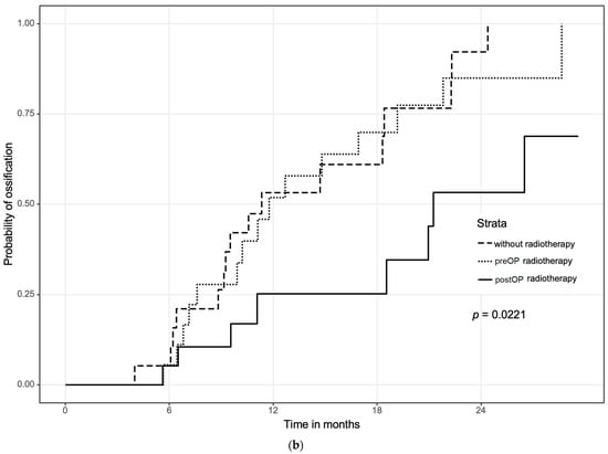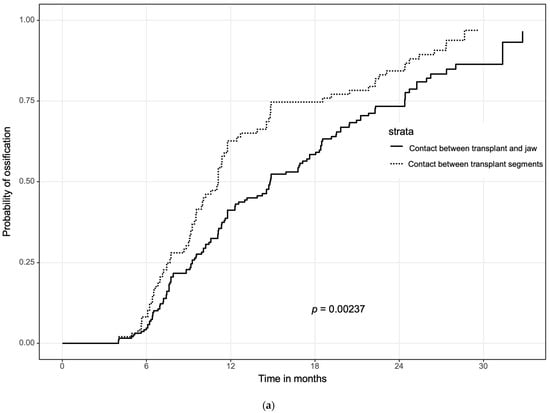 In a multivariable model, only postoperative radiation therapy showed significantly slower ossification with p = 0.002, and contact between segments of the bone graft with p = 0.035 (Table 3).