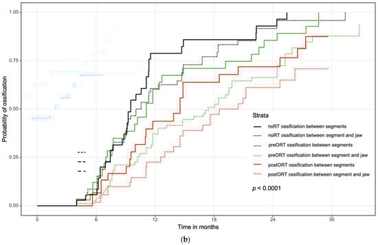 After testing all subgroups against each other (Table 2), the control group with nonirradiated patients achieved the fastest ossification without any significant difference between the two segments of the transplant and one segment of the transplant and the original bone (p = 0.334). In patients with preoperative radiotherapy, the contact area between two transplant segments showed a similar ossification rate compared to the nonirradiated control group (p = 0.659 and p = 0.128), whereas ossification between the graft and native jaw bone was significantly worse (p < 0.001). In patients with postoperative radiotherapy, ossification between the graft segments was significantly slower than in the control (p = 0.040 and p = 0.003), and was slower than the preORT group, but ossification was still faster than ossification between the graft and native jaw bone without reaching significance (p = 0.094). Overall, ossification was worst between the graft and jaw bone in both the preORT and postORT groups (Figure 3b).