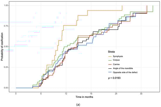 Regarding different jaw regions, the symphysis showed fastest overall complete ossification with a median of 302 (IQR 264–340) days (Figure 4a). This value was significantly faster than all other examined regions (p = 0.039 to p = 0.003).