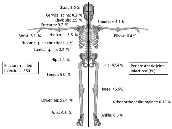 With an increasing number of fractures, the rate of complications is increasing. One major complication after internal fixation of fractures are infections, which occur in 1–2% of all fractures. The prevalence of fracture related infections (FRI) has increased by 28% within the last eleven years []. FRIs represent a risk for the success and positive outcome of fracture treatment. Fracture treatment and elective joint replacements have the risk of complications such as infections, and these represent a huge problem for patients, surgeons and the economy [,]. An increasing rate of almost 25% for total knee arthroplasties performed in Germany was reported in the last decade. Likewise, septic revisions due to PJI increased by over 50% within the last decade [,]. Similarly, an incidence of PJI between 23.5 and 27.8 per 100,000 inhabitants in Germany was detected and showed constant growth []. Both types of infection require long and intense therapy, usually a combination of multiple revision surgeries and long-term antibiotic therapy [,]. Even years after infection, a significantly reduced quality of life has been reported despite successful surgical treatment [,].