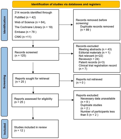 Figure 1 shows the process of literature search and study selection. Electronic searches of five databases revealed 214 records. After screening titles and abstracts, we found 25 articles relevant to the study aim, and therefore we retrieved the full-text articles. After full-text analysis, another 13 studies were excluded for the following reasons: nine lacked necessary data, two reported duplicated data, and only two studies only reported one patient. Finally, 12 studies fulfilled our eligibility criteria and were enrolled in this review [27,28,29,30,31,32,33,34,35,36,37,38].