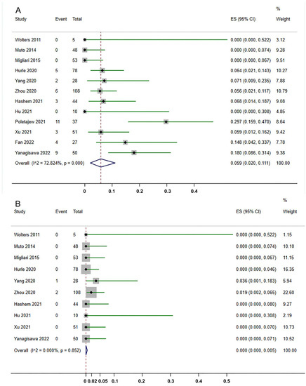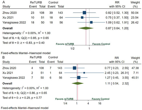 All 12 studies reported the status of residual tumor after ERBT. The residual tumor rate varied from 0% to 29.3%. As shown in Figure 2A, pooling the data from 539 patients demonstrated that the residual tumor rate detected by reTURB after ERBT was 5.9% (95%CI, 2.0%–11.1%). Only one study reported the residual tumor location [38]. Among 50 patients, six had residual tumors at the original site, while two were at the non-original site. Ten studies revealed the upstaging rate at reTURB after ERBT ranged from 0% to 3.57%. Surprisingly, as shown in Figure 2B, the meta-analysis demonstrated that the upstaging rate at reTURB is 0.0% (95%CI, 0.0%–0.5%).