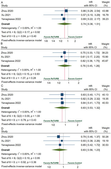 Forests plots of comparisons of 1-year RFS (A), 2-year RFS (B), 3-year RFS (C), and 5-year RFS (D) between the reTURB group and control group [32,36,38]. The gray lines represent the reference lines and the red lines show the pooled effect sizes. RFS: recurrence-free survival; HR: hazard ratio; reTURB: repeat transurethral resection of bladder tumors; CI: confidence interval.