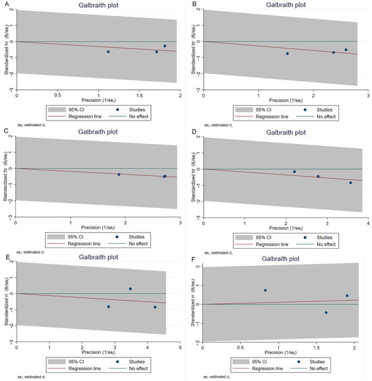 The NOS scores of three cohort studies have been shown in Table S1, and the quality of these three studies was considered high. All the other studies except for the RCT article have been assessed by the five-criterion quality appraisal checklist and consider to be at high risk of bias (Table S2). Heterogeneity among comparative studies was evaluated by the chi-square test, I2 statistics, and Galbraith plots (Figure 5). No significant heterogeneity was detected. Although no significant publication bias was found in the funnel plot (Figure 6), Egger test, and Begg’s test (Table S3). We also performed a sensitivity analysis. The sensitivity analysis using the trim and fill method generated similar results, which indicated these pooling results were stable and reliable (Table S3). Figure S1 shows the funnel plots of sensitivity analysis.