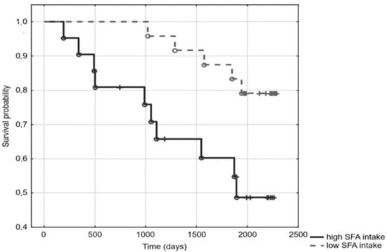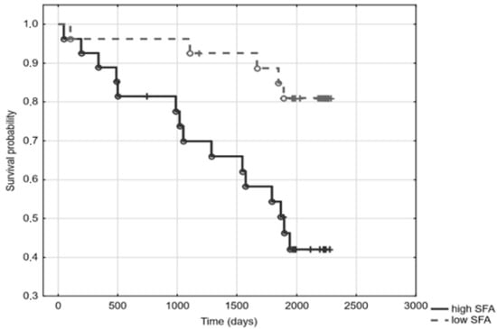 Out of the 54 patients under study, 12 had been diagnosed with DM, and 26 with CVD. The median of the observation time was 66 months (range 2–76 months). During the observation, 22 patients died. Kaplan–Meier analysis revealed a significant relationship between elevated SFA (above SFA mean) and mortality (log-rank 3.13; p = 0.0017) (Figure 1). In the Cox regression model, the hazard ratio for mortality associated with increased SFA content equalled 4.47 (1.63–12.26). Moreover, patients who ingested foods rich in SFA, according to FFQ-6, had a higher mortality risk (log-rank 2.24; p = 0.03) (Figure 2). However, as seen in Table 1, containing the general characteristics of the studied patients divided into groups according to SFA mean, patients with high SFA content turned out to be slightly older, more inflamed, and had a higher prevalence of DM and CVD (Table 1). Indeed, SFA content was significantly higher in diabetic patients, as compared to patients free from DM (35.2 ± 1.6 vs. 33.3 ± 2.8; p = 0.03), and was elevated in patients with CVD when compared to patients without it (34.9 ± 1.8 vs. 32.6 ± 2.9; p < 0.001). In Cox regression, the addition of age and inflammation (hsCRP > 5 mg/L) into the model did not modify the relationship between high SFA and mortality. However, addition of DM and CVD attenuated this relationship, making it statistically insignificant; HR 2.47 (0.78–7.71). According to food questionnaires, SFA content was associated with ingestion of food rich in saturated fat, although these relationships did not reach statistical significance. No associations between SFA and lipoprotein subclasses or with total cholesterol were observed. Sub-group analyses in patients stratified according to the use of HMG-CoA inhibitors revealed comparable results (Table S1). There were also no significant differences in the analysed variables between HD and PD patients (Table S2).