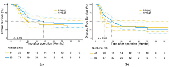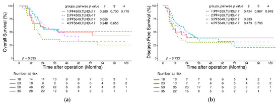 In the survival analysis, the median follow-up time for all patients was 22.6 (interquartile range: 11.9–42.5) months. The 3-year OS and DFS rates in the entire cohort were 52% and 36%, respectively, and the 3-year locoregional-specific DFS rate was 46%. No significant differences were found in 3-year OS and DFS between patients in the PF4500 and PF5040 groups (OS: 45% versus 54%, p = 0.218; DFS: 34% versus 37%, p = 0.506, Figure 1a,b). Further analysis based on the total LND number revealed no significant differences in 3-year OS and DFS (Figure 2a,b).