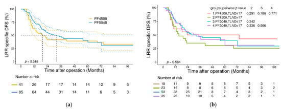 Regarding 3-year locoregional-specific DFS, no significant differences were found between patients in the PF4500 and PF5040 groups (3-year locoregional DFS: 42% versus 47%, p = 0.518, Figure 3a). Subgroup analysis of local control was performed according to LND number. As shown in Figure 3b, in both the PF4500 and PF5040 groups, no significant differences were found in 3-year locoregional-specific DFS between patients with a total LND number ≤ 17 and >17 (PF4500 group, 35% versus 50%, p = 0.291; PF5040 group, 45% versus 46%, p = 0.866). Between the PF4500 and PF5040 groups, the patients with a total LND number ≤ 17 had comparable 3-year locoregional-specific DFS (50% versus 46%, p = 0.788). Between the PF4500 and PF5040 groups, the patients with a total LND number > 17 also had comparable 3-year locoregional-specific DFS (35% versus 45%, p = 0.336).