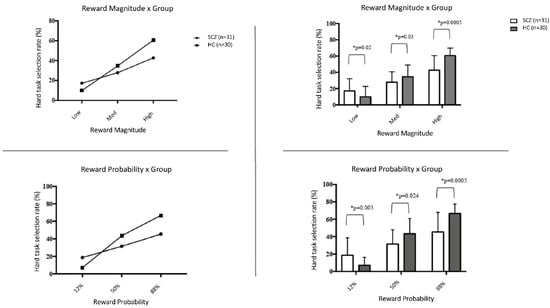 The proportions of hard task selection across patient groups in different reward probability and reward magnitude conditions. * Significance level at p < 0.05.