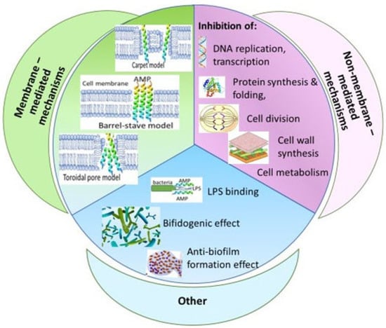 The main mechanism of AMP antimicrobial action is the disruption of the cell membrane []. This action is mediated by hydrophobic amino acids and cationic charge, which facilitate the binding of AMPs to the cell membrane of microorganisms, (composed of anionic lipids—phosphatidylglycerol and cardiolipin) []. Following their attachment to the cell membrane, the AMPs form pores allowing the outflow of anions through the membrane, leading to membrane depolarizing, thus killing the bacteria []. In contrast, AMPs have low affinity to the mammalian cell membrane, which is rich in electrically neutral phospholipids (phosphatidylcholine and sphingomyelin) []. For certain AMPs, non-membrane mechanisms of antibacterial action have also been described, including entering the bacterial cell after binding to the cell surface receptors [,]. Within the cell, AMPs inhibit critical cell functions such as DNA replication, protein synthesis and folding, protease activity, cell division, and cell metabolism [,] (Figure 1).