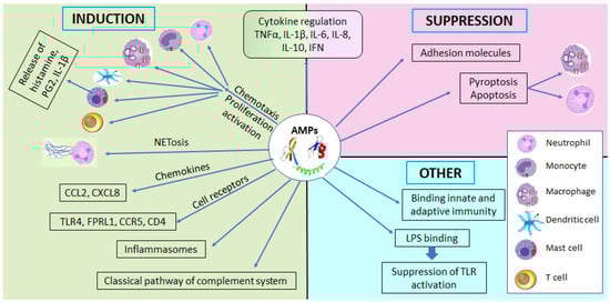 In addition to their bactericidal activities, defensins and LL-37 have important immunomodulating and inflammation-regulating properties, as summarized in Table 1 and Figure 2 [,,,,,,,,,,,]. They exert a strong chemotactic action on immune cells, and regulate cytokine, chemokine, and adhesion molecule production [,,,,,,,]. In vitro and experimental studies have shown that LL-37 suppresses the pyroptosis and activation of macrophages, as well as the development of neutrophil apoptosis, while stimulating bactericidal capacity [,,,,]. In addition, HBD-1 promotes the differentiation of cord-blood monocytes to immature dendritic cells, and inhibits their apoptosis. HBD-3 exerts mainly anti-inflammatory actions [].