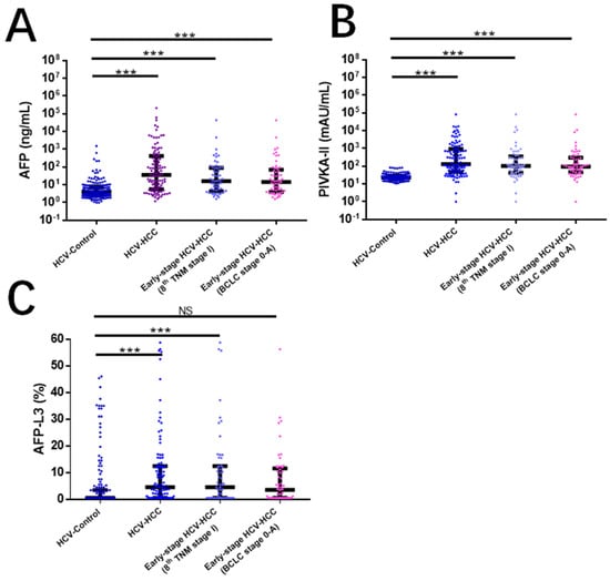 Serum concentrations of three HCC biomarkers. (A) AFP; (B) PIVKA-II; (C) AFP-L3. *** p < 0.001; NS, not significant.