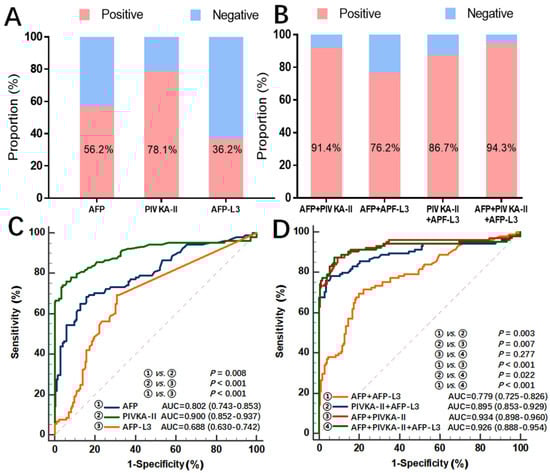 Peripheral blood was collected from each patient. Blood samples were separated by centrifugation at 700× g for 10 min. Serum was then aliquoted and immediately frozen at −80 °C until testing. The sample storage facilities were standardized at each participating hospital. Serum samples were sent to the Abbott testing centers on a regular basis. Serum concentrations of PIVKA-II and AFP were measured with the ARCHITECT immunoassay (Abbott Diagnostics, Chicago, IL, USA). Serum concentrations of AFP-L3 were detected utilizing the Fujirebio assay (Fujirebio Diagnostics, Tokyo, Japan). The lowest measurable values of AFP, PIVKA-II, and AFP-L3 were 0.6 ng/mL, 5.0 mAU/mL, and 0.5%, respectively. The technicians carrying out the laboratory tests were blinded to the diagnosis of all participants.