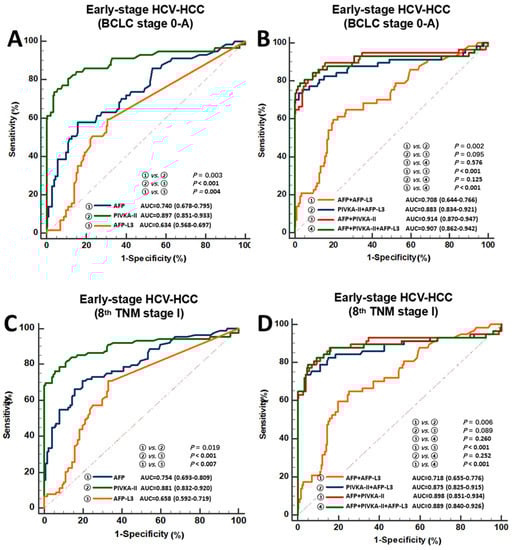 Diagnostic performance of AFP, AFP-L3, or PIVKA-II alone and in combination for the detection of early-stage HCV-induced HCC. BCLC stage 0-A: (A) AFP, PIVKA-II, or AFP-L3 alone; (B) Any combination of two or three biomarkers, 8th TNM stage I: (C) AFP, PIVKA-II, or AFP-L3 alone; (D) Any combination of two or three biomarkers. AUC, the area under the curve; HCC, hepatocellular carcinoma; HCV, hepatitis C virus.