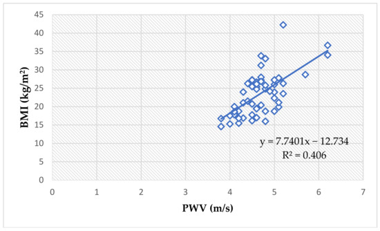 The correlation between PWV values and BMI values in all children (Spearman’s ρ = 0.58, p < 0.0001).