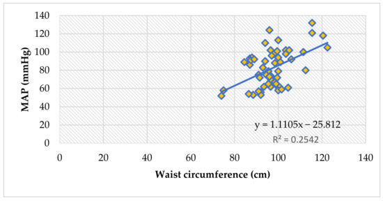 The correlation between mean arterial pressure and waist circumference, in all children (Spearman’s ρ = 0.42, p = 0.001).
