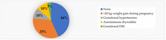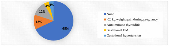 With regard to maternal risk factors, we noted that 56.6% of the subjects were born to unhealthy mothers. Out of the total cases, 33% gained >20 kg during pregnancy, making this the most prevalent risk factor we have encountered. Gestational hypertension and autoimmune thyroiditis were detected in 10% of the cases each, while gestational DM was present in only 3% of the cases (Figure 4).
