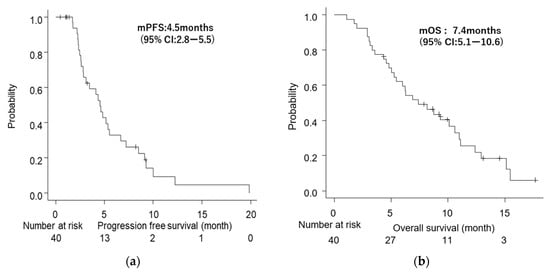 Table 4 shows the adverse events (AE) during nal-IRI/FF treatment. The most common AEs included neutropenia (63%), general fatigue (63%), and leukopenia (60%). Eleven patients had grade 3 neutropenia. None of the patients experienced febrile neutropenia or ≥grade 3 thrombocytopenia. Regarding the severe (≥grade3) non-hematologic AEs, general fatigue was observed in nine patients, anorexia in two patients, and diarrhea, which led to acute renal dysfunction in one patient. Dose reduction was conducted due to neutropenia in nine (23%), general fatigue in nine (23%), and diarrhea in two (5%) patients. Ten patients (25%) required discontinuation of treatment. Six out of ten patients stopped the therapy due to general fatigue, and the treatment for the remaining was discontinued due to diarrhea, hemobilia, septic shock, and ileus. Six of the patients were moved to another line of chemotherapy.
