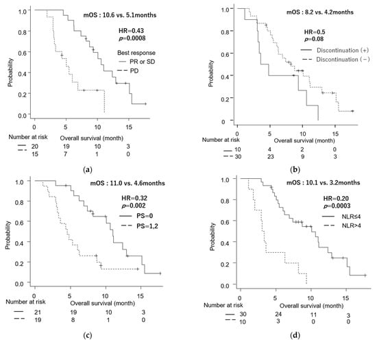 Kaplan–Meier survival analyses. (a) Overall survival (OS) with the best response = progressive disease (PD) versus stable disease (SD) or partial response (PR). (b) OS with treatment discontinuation versus without discontinuation. (c) OS with performance status (PS) = 0 versus PS = 1, 2. (d) OS with neutrophil-lymphocyte ratio (NLR) > 4 versus NLR ≤ 4. mOS, median overall survival; HR, hazard ratio. p-value was calculated using the log-rank test.