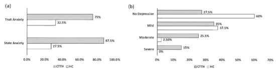 Presence of anxiety (a) and level of depression (b). CTTH: chronic tension-type headache. HC: healthy control.