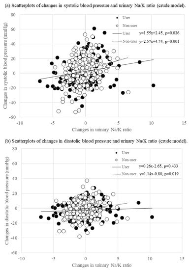 Scatterplots of changes in blood pressure and the urinary Na/K ratio by using antihypertensive medication.