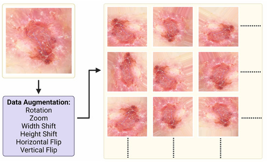 Data augmentation techniques reduce overfitting and increase the performance of the models [31]. In order to increase the number of images in the dataset, the lesion area was cropped manually, and the images that contain the lesion were added to the dataset. In order to increase the training data, an image generator was created. The image generator for augmentation accepts a batch of images, applies augmentation techniques on each image, and replaces the original images with augmented images. Since the lesions are invariant when rotated and moved at any angle, six different augmentation methods were applied to the images: rotation, zoom, width and height shift, vertical and horizontal flip. It has been shown that these techniques increase the performance in image classification [32]. Images are augmented with a 45-degree rotation range, 0.2-percent focusing range, and 0.2-percent width and height shift. Example patch images of an augmented image from the dataset are shown in Figure 3. The parameter names and values of the data augmentation techniques are shown in Table 2.