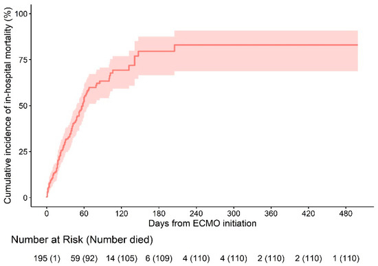 The estimated cumulative incidence of in-hospital mortality 240 days after the initiation of ECMO was 82.9% (95% CI 68.7–90.7) (Figure 1). Cause of death was multiorgan failure (n = 22), neurological complication (n = 3), septic shock (n = 58), and others such as bleeding or lung fibrosis (n = 27).