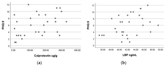 In the present study, the correlations between zonulin and IFAB 2 and depression are statistically insufficient. On the other hand, we identified two positive correlations, i.e., between depression levels assessed using the PHQ 9 questionnaire and calprotectin and LPS. Stevens et al. [] found that zonulin and FABP2 were each significantly elevated in the depression versus nondepressive control groups. Anxiety and depressive disorders have been associated with intestinal dysbiosis and the growth of molecules of intestinal epithelial integrity in the blood of asymptomatic subjects with gastrointestinal physical suffering. These findings highlight the fact that the gut can be considered a new target for managing depression, especially in physically asymptomatic people with gastrointestinal disorders.