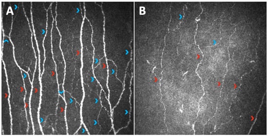 Images of the sub-basal nerve plexus captured with Heidelberg Retina Tomograph III Rostock Corneal Module (Heidelberg, Germany) from the central cornea of a healthy subject (A) and a diabetic subject with diabetic peripheral neuropathy (B). The comparison clearly shows the paucity of corneal nerve fibers in the diabetic neuropathic patient; in particular, there is evidence of a reduction in both the main fibers (red arrowheads) and the branches (blue arrowheads), determining a decrease in corneal parameters of length and density such as CNFL, CNFD, and CNBD.
