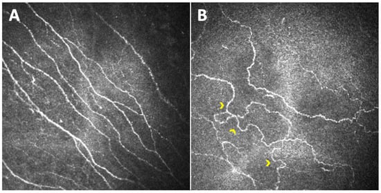 Images of the sub-basal nerve plexus captured with Heidelberg Retina Tomograph III Rostock Corneal Module (Heidelberg, Germany) from the central cornea of a healthy subject (A) and a diabetic subject with diabetic peripheral neuropathy (B). While the corneal nerve fibers of the healthy subject are mostly straight, those of the diabetic neuropathic patient show increased tortuosity (yellow arrowheads).