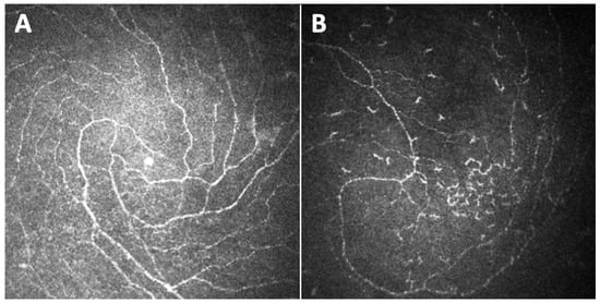 Our group previously demonstrated how CCM could represent an in vivo, non-invasive, and reproducible diagnostic technique [] for the study of corneal morphological alterations not only in diabetic patients but also in other conditions such as post-refractive surgery [,], topical chemotherapy in ocular surface squamous neoplasia [], vernal keratoconjunctivitis [], Wilson disease [], oxaliplatin-induced peripheral neuropathy [], therapy with epidermal growth factor receptor (EGFR) inhibitor depatuxizumab mafodotin (ABT-414) in patients affected by EGFR-amplified recurrent glioblastoma [,], and recently in COVID-19 recovered patients [].