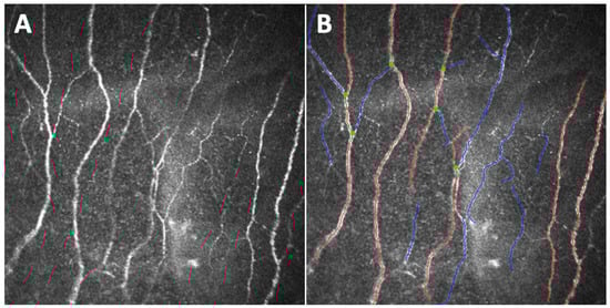 An example of elaboration via ACCMetrics software (B) of an image of the sub-basal nerve plexus captured with Heidelberg Retina Tomograph III Rostock Corneal Module (Heidelberg, Germany) from the central cornea of a healthy subject (A). The elaborated image shows main fibers in red, branches in blue, and branching points in green.