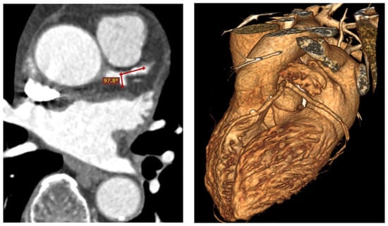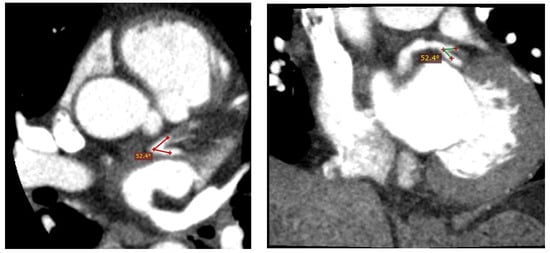 The current literature provides evidence to suggest that wide LAD-LCx angle is associated with CAD [,,,]. Between the eight causal-comparative studies investigating this relationship, both CCTA and ICA were used to measure LAD-LCx angle. Whilst ICA has traditionally been considered the gold standard for coronary artery evaluation, both modalities are valid tools for measuring coronary angles []. CCTA has proven to be an accurate tool for assessing LAD-LCx angle (Figure 4), exhibiting comparable, if not superior sensitivity, specificity, and positive predictive values to those of standard lumen assessment by ICA [].