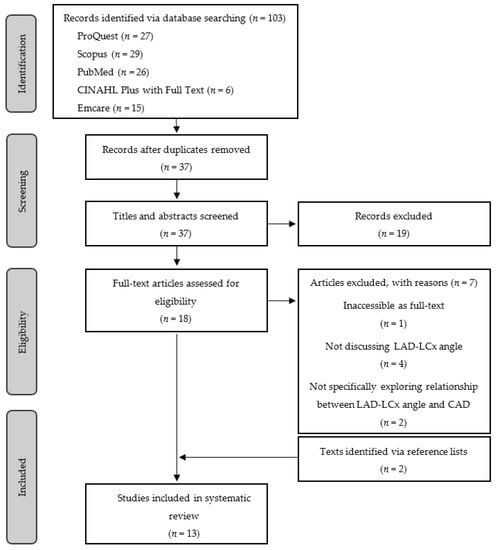 The search initially returned a total of 103 records across the five selected databases. Sixty-six duplicates were excluded, and the titles of the remaining 37 records were screened for eligibility. Several articles with titles describing irrelevant subject matter were excluded, such as those referencing interventional techniques for treating coronary bifurcation stenosis. One article was unavailable as a full text and was not included in this review. Of the remaining 18 full texts, four articles did not analyse LAD-LCx angle, and two did not specifically assess the relationship between LAD-LCx angle and CAD, and were consequently also excluded. The reference lists of the included texts were examined for texts with eligible titles, and two additional articles were identified for inclusion. Thirteen articles were found to meet the specified eligibility criteria and were included in this review (Figure 3).