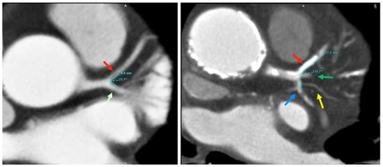 - Rodriguez-Granillo, G.; Rosales, M.; Degrossi, E.; Durbano, I.; Rodriguez, A. Multislice CT coronary angiography for the detection of burden, morphology and distribution of atherosclerotic plaques in the left main bifurcation. Int. J. Cardiovasc. Imaging 2007, 23, 389–392. [Google Scholar] [CrossRef]