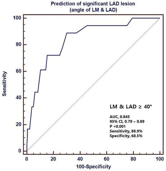 The receiver operating characteristic (ROC) curve for the LM-LAD angle in the prediction of LAD stenosis. The area under the curve is 0.845. LM—left main coronary artery, LAD—left anterior descending, CI—confidence interval. Reprinted with permission under the open access from Moon et al. [] 2018, Public Library of Science.