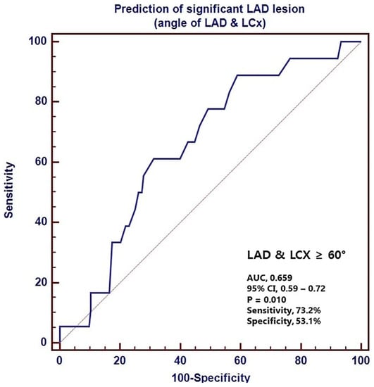 The receiver operating characteristic (ROC) curve for the LAD-LCx angle in the prediction of LAD stenosis. The area under the curve is 0.659. LAD—left anterior descending, LCx—left circumflex, CI—confidence interval. Reprinted with permission under the open access from Moon et al. [] 2018, Public Library of Science.