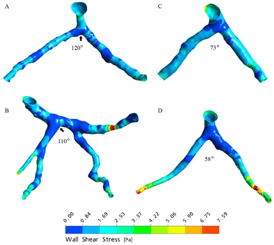 Wall shear stress observed with variable angles of the realistic left coronary artery models generated at peak systolic phase of 0.4 s. (A,B) refer to models with wide LAD-LCx angles, while (C,D) refer to models with narrow LAD-LCx angles. Arrows refer to the low wall shear stress distributions at large bifurcations. Reprinted with permission from Chaichana et al. [] 2011, Elsevier.