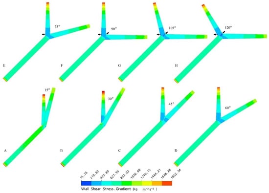 Wall shear stress gradient observed with variable angles of the simulated left coronary artery models generated at peak systolic phase of 0.4 s. (A–H) simulated coronary artery models with different LAD-LCx angles ranging from narrow to wide angulation. Arrows refer to the wall shear stress gradient distributions and a big region of the low magnitude present at 120° angulation model. Reprinted with permission from Chaichana et al. [] 2011, Elsevier.
