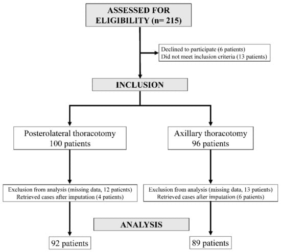 Two hundred and fifteen patients were approached from July 2014 to November 2015, with one hundred and ninety-six finally included. Ninety-six patients underwent surgery through an AX incision, and one hundred underwent surgery through a PL incision. Initially, 25 patients (13 in the AX group and 12 in the PL group) were excluded from analysis due to missing pain scores. However, after imputation of the missing data, ten patients (six in the AX group and four in the PL group) were retrieved for data analysis. The analysis concerned 89 patients in the AX group and 92 patients in the PL group (Figure 1).