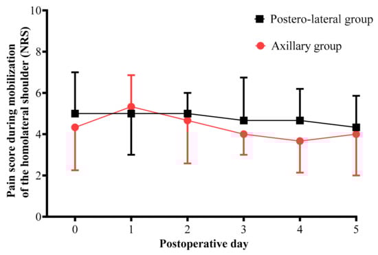 Pain scores for mobilization of the ipsilateral shoulder from the day of surgery to postoperative day 5 were similar in both groups (p = 0.83, Figure 2).