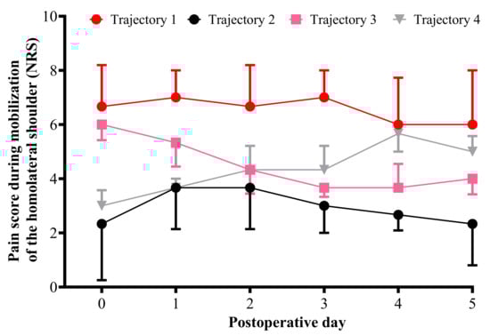 Comparison of pain score for mobilization of the ipsilateral shoulder measured from the day of surgery to postoperative day 5 for each trajectory. For each trajectory the median pain score is represented (numeric rating scale: 11-point scale for patient self-reporting of pain from 0 = no pain to 10 = maximal imaginable pain). The black line represents median pain scores in cluster 1 (permanent significant pain group). The red line represents median pain scores in cluster 2 (permanent moderate pain group). The pink line represents median pain scores in cluster 3 (decreasing pain group). The gray line represents median pain scores in cluster 4 (increasing pain group).