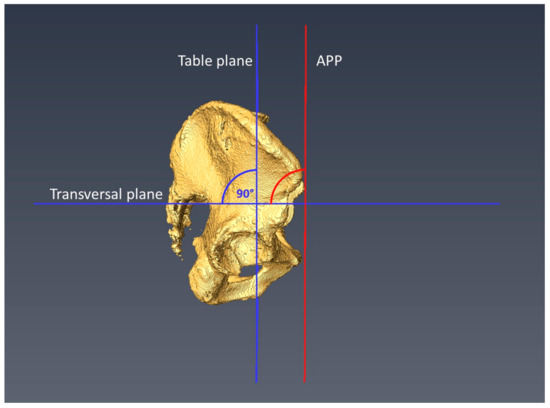 The acetabular anteversion was measured through the angle of the acetabular entry plane and the table plane in the transversal plane for the determination of the functional acetabular anteversion (fAA). Anatomic acetabular anteversion (aAA) was determined by the angle between the acetabular entry plane and the APP in the transverse plane, as shown in Figure 3a. The functional anatomical anteversion (fAA) was measured by the angle between the sagittal plane and the acetabular entry plane in the transversal plane. The anatomic acetabular anteversion (aAA) results from the angle of the acetabular entry plane and the anterior pelvic plane (APP), from which 90° had to be subtracted to obtain the aAA.