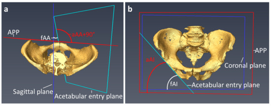 The functional acetabular inclination (fAI) was determined by the angle between the acetabular entry plane and the longitudinal axis of the coronal plane. The anatomical acetabular inclination (aAI) was determined by the angle between the acetabular entry plane and the longitudinal axis of the APP, as shown in Figure 3b.