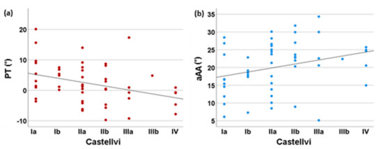 Influence of the Castellvi degree of LSTV on pelvic tilt and anatomical acetabular anteversion. In (a), the significant negative correlation between the degree of LSTV according to Castellvi and the pelvic tilt is given. (b) Depicts the significant positive correlation between anatomical acetabular anteversion and the degree of LSTV according to Castellvi. LSTV = Lumbosacral transitional vertebrae, PT = pelvic tilt, aAA = anatomical acetabular anteversion.