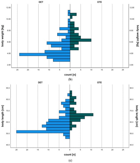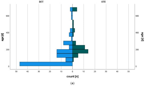 Demographics and intraoperative characteristics differed significantly between OTE and DET group. On table extubated children were significantly older (267 ± 163 OTE vs. 127 ± 148 DET days mean ± SD, p < 0.0001), had a higher body weight (7.0 ± 1.6 OTE vs. 4.9 ± 1.9 DET kg mean ± SD, p < 0.0001), and were larger (68 ± 8 OTE vs. 59 ± 8 DET cm mean ± SD, p < 0.0001) compared to children that were DET during intensive care treatment (Figure 1a–c).