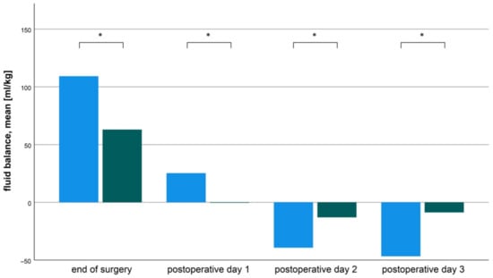 Patients in the OTE group received significantly fewer RBC transfusions (35 ± 16 OTE vs. 75 ± 39 DET ml/kg, mean ± SD, p < 0.0001) and fewer crystalloid fluids substitutions (63 ± 563 OTE vs. 109 ± 82 DET ml/kg, mean ± SD, p < 0.0001) compared to DET group relative to absolute body weight. After the intraoperative fluid loading, patients in the DET group showed greater negative fluid balances during the postoperative course (Figure 2).