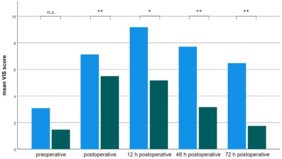 Mean vasoactive-inotropic score (VIS) in delayed extubation (DET) group (blue bars) and on-table extubation (OTE) group (green bars) preoperative, postoperative, 12 h postoperative, 48 h postoperative, 72 h postoperative. n.s. not significant, * p < 0.05, ** p <0.001.