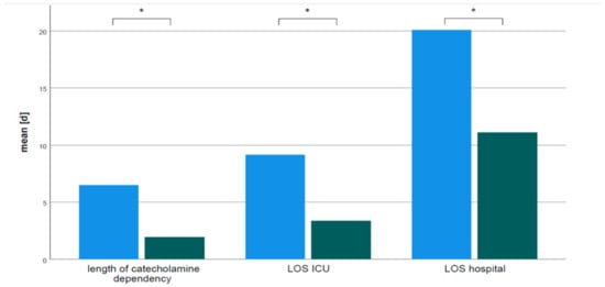 Mean duration of catecholamine dependency, intensive care therapy LOS ICU), and length of hospital stay (LOS hospital) in delayed extubation (DET) group (blue bars) and on-table extubation (OTE) group (green bars). All differ significantly * p < 0.0001.